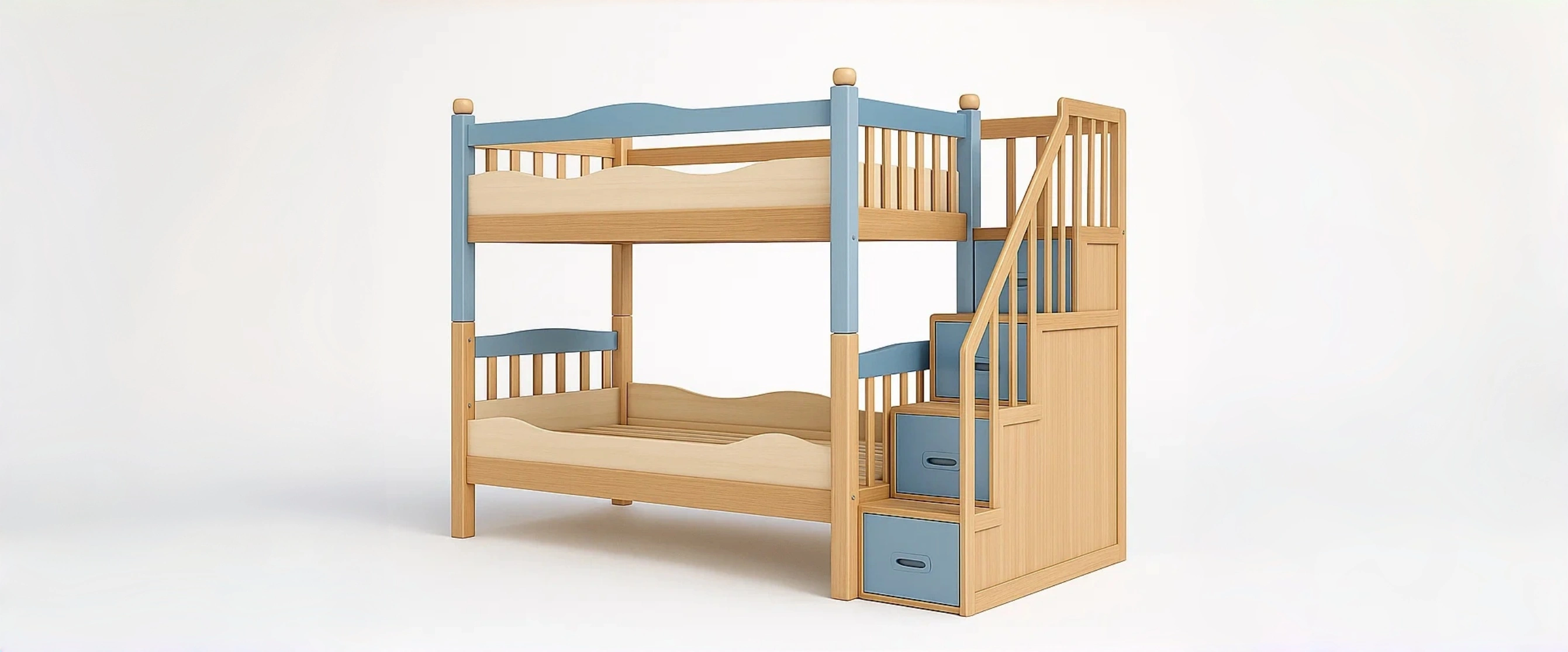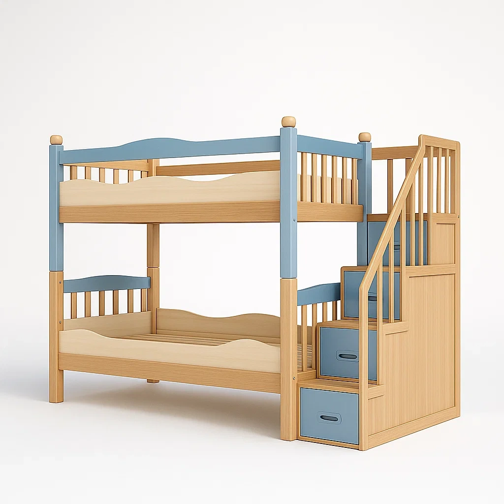 Lit superposé en bois avec escaliers et tiroirs en hêtre et bleu
